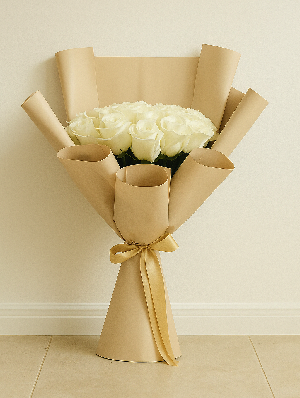 In the UAE’s luxury floral market, a white rose bouquet of this scale is the premier choice for high-end weddings, anniversaries, and formal congratulations. Our design stands out by using the Athena variety, which offers a higher petal count and longer vase life than standard roses. As a leading provider of the white rose bouquet in Dubai and Abu Dhabi, we hand-tie every arrangement with precision, offering an optional touch of fresh greenery for natural balance and a modern, garden-fresh silhouette.