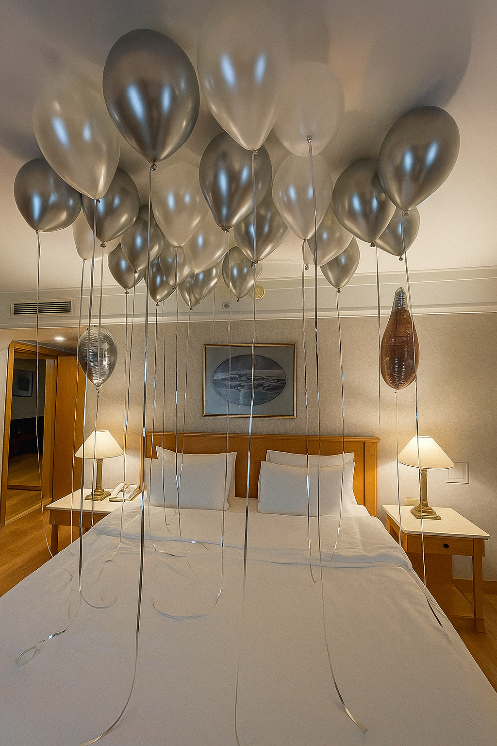 ✨ Add elegance to your celebration with our silver and white helium balloon decoration in UAE. This setup includes 20 silver helium balloons and 15 white helium balloons, creating a classy and festive atmosphere for birthdays, anniversaries, and special occasions. Perfect for room surprises and parties in Dubai, Abu Dhabi, Sharjah, and across the UAE. Same-day delivery available for all balloon decorations.