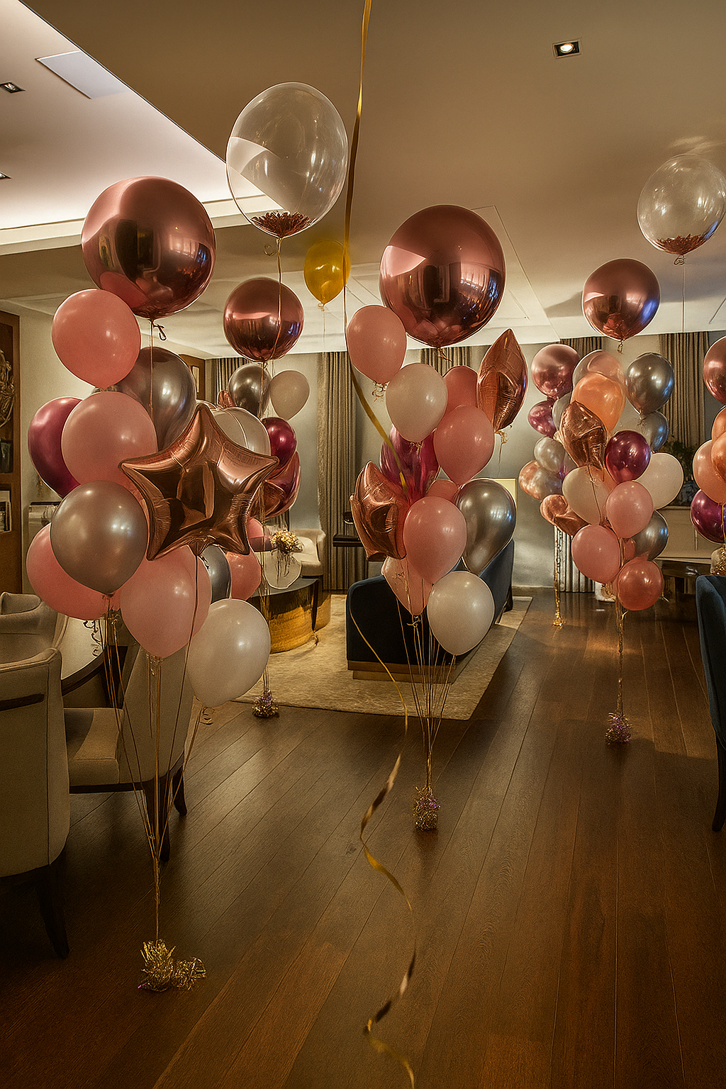 ✨ Surprise your loved one with a luxury balloon and flower decoration in UAE. This setup includes 96 premium helium balloons and a stunning 40-stem pink rose bouquet, creating the perfect romantic atmosphere. Ideal for birthdays, anniversaries, proposals, and room surprises in Dubai, Abu Dhabi, Sharjah, and across the UAE. Same-day delivery available for all our premium balloon and flower decorations.