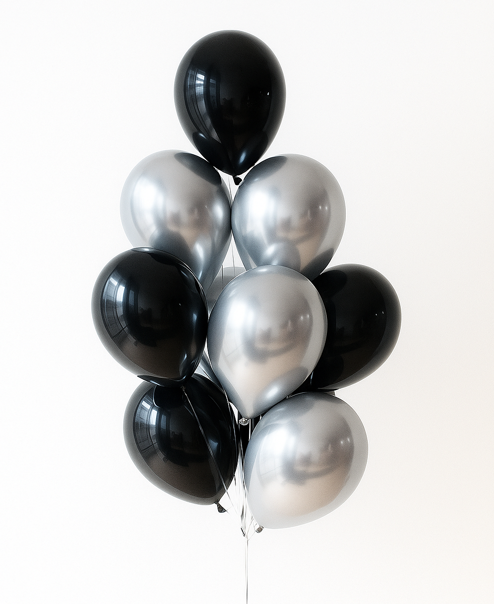 Make every occasion stylish and memorable with our Black & Silver Helium Balloon Bouquet. Featuring a stunning mix of premium black and metallic silver balloons, this 10-piece bunch is the perfect décor choice for birthdays, anniversaries, themed parties, and professional events. Delivered inflated and ready to use, they add instant charm to any setting.