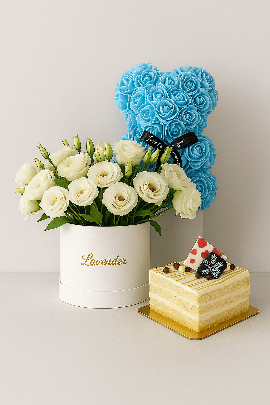 This luxury creation includes a small blue rose bear symbolizing calmness and love, paired with 20 white lisianthus stems that express grace and purity. To complete the experience, a fresh butterscotch pastry adds a delightful gourmet touch perfect for sharing joy and affection.