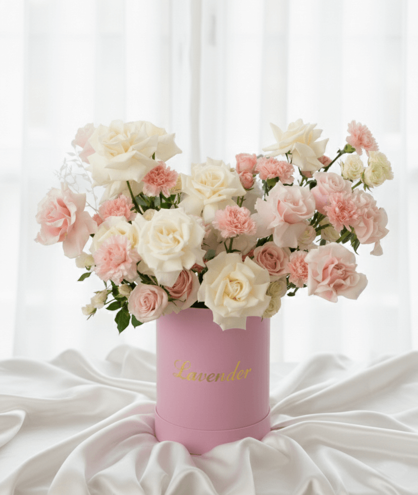 Celebrate the beauty, grace, and strength of women with our exquisite Blush Harmony Rose Box, thoughtfully designed for Women’s Day. This elegant floral arrangement features a delicate blend of creamy white roses, soft pink roses, and charming pink carnations, beautifully styled in a premium pastel pink hat box.