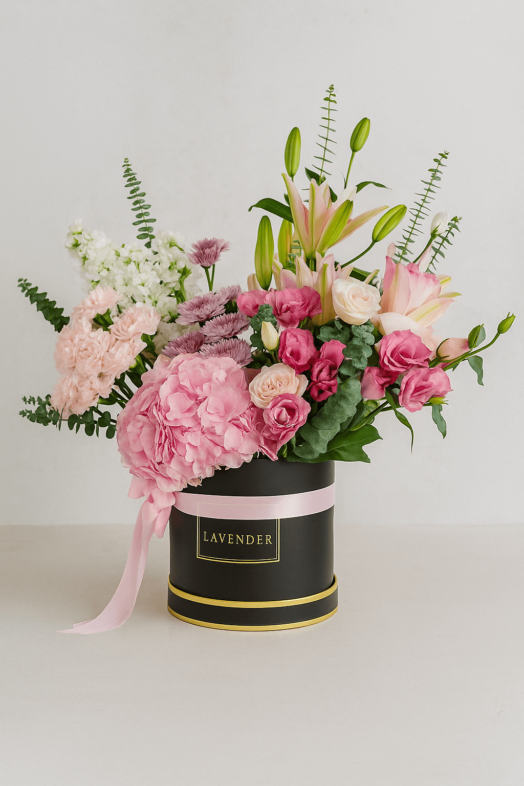 A graceful blend of pink hydrangeas, carnations, white mattiula, pink lilies, lisianthus, and chrysanthemum, beautifully balanced with fresh eucalyptus and arranged in a stylish box, is the perfect expression of softness, charm, and elegance. 🌸🤍🌿