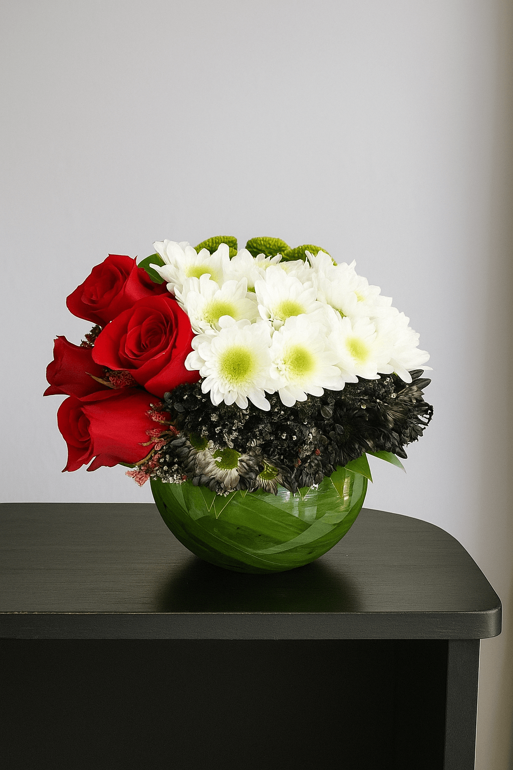 Order the Fish Bowl Flower Arrangement UAE for National Day. Features Red roses, White daisies, and Black/Green elements in a modern glass vase. Perfect centerpiece!
