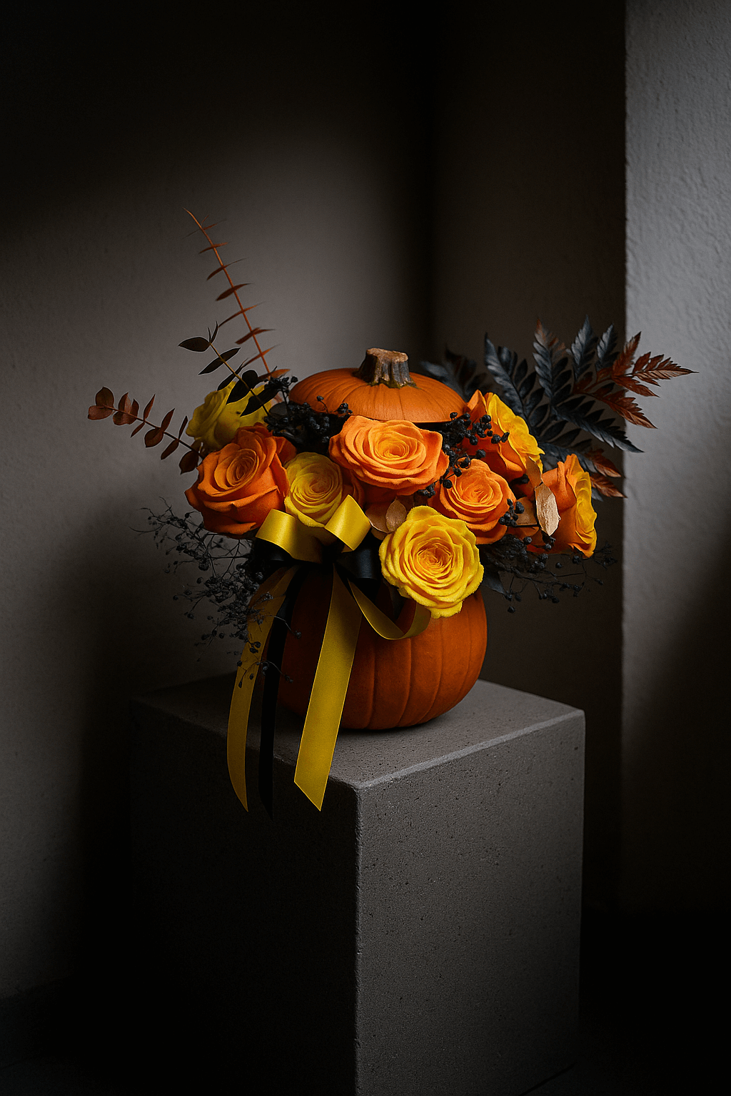 This unique design features a real pumpkin base filled with an enchanting mix of bright yellow and orange roses, accented with dark autumn foliage, dried details, and seasonal textures. A bold yellow and black satin ribbon completes the look, adding the perfect Halloween flair.