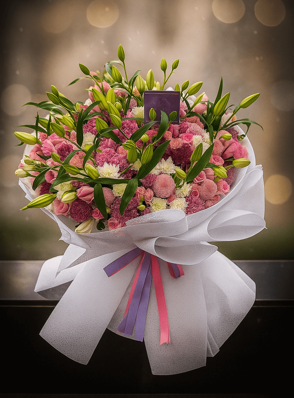 - 💐 40 Carnations (Purple, Pink & White) – lush fullness and gentle charm