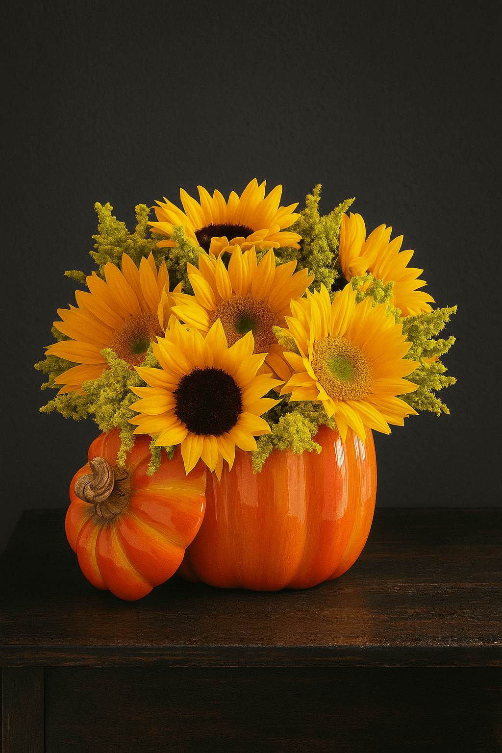 Celebrate the spirit of Halloween with this stunning Pumpkin Harvest Floral Arrangement. Designed in a realistic pumpkin vase, this arrangement combines the warmth of autumn colors with the charm of seasonal blooms. Bright sunflowers, yellow chrysanthemums, and orange daisies are beautifully accented with berries, eucalyptus leaves, and fall foliage creating a perfect centerpiece for your home, office, or Halloween event.