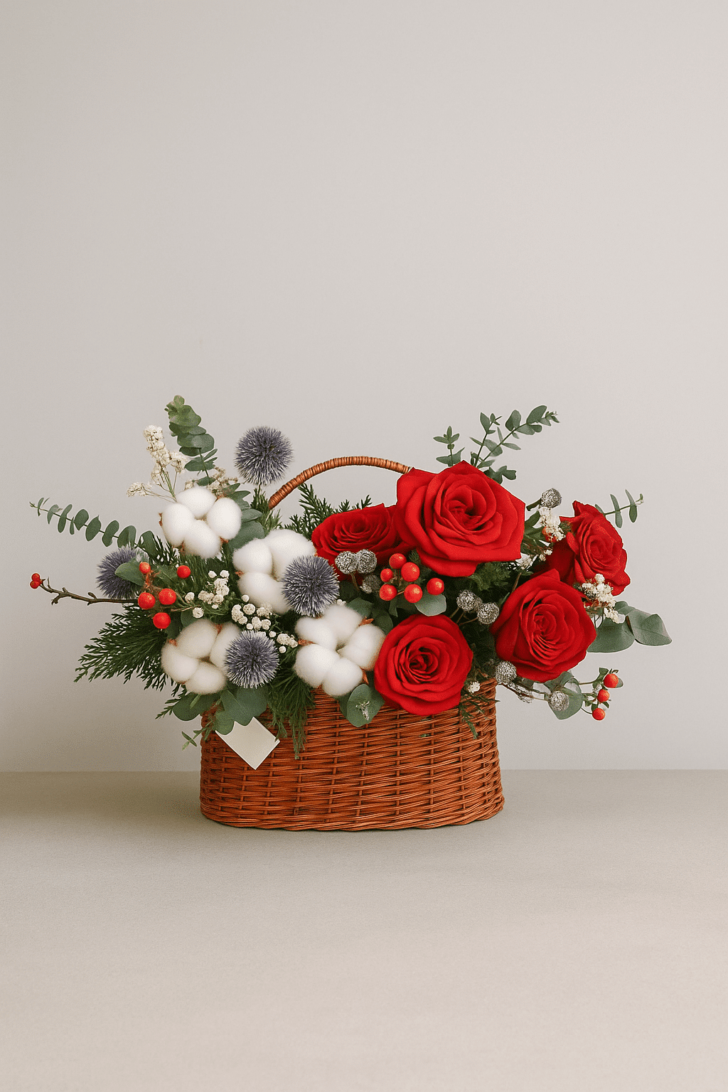 Experience the magic of the holiday season with our signature “Winter Woodland” collection. This masterfully designed Christmas flower basket is a hand-crafted arrangement that blends the timeless elegance of deep crimson roses with the cozy, wintry charm of natural cotton bolls. Whether you are searching for a unique holiday centerpiece or a thoughtful Christmas flower basket to surprise a loved one in Dubai, this arrangement is designed to bring warmth and joy to every UAE home.
