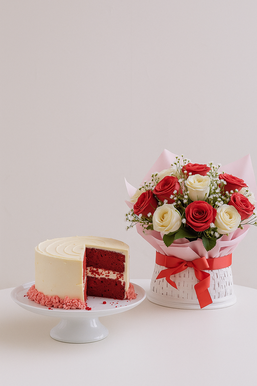 Celebrate love and elegance with our Velvet Romance & Rose Delight Set featuring a rich red velvet cake and a red-white rose basket wrapped in style. Ideal for anniversaries, birthdays, and romantic gifting across Dubai and the UAE. Order now for same-day delivery!