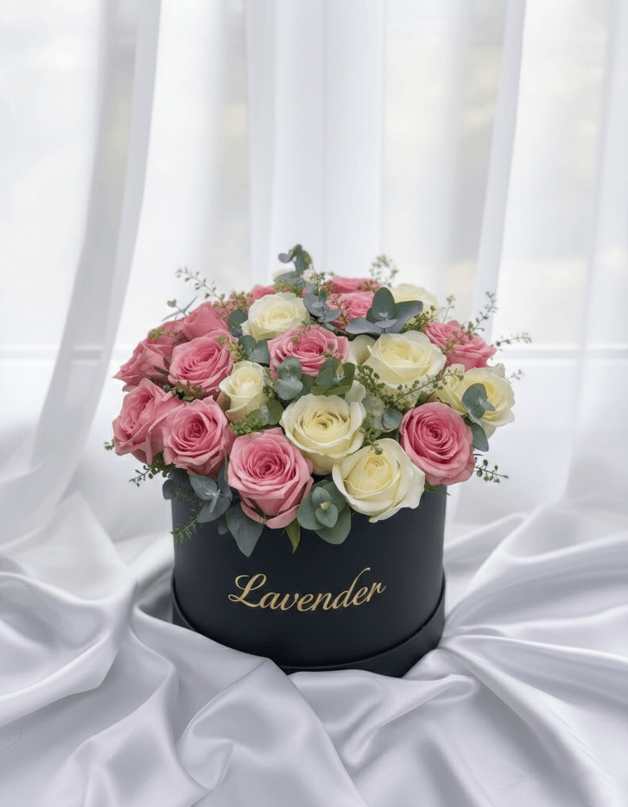 Celebrate elegance, strength, and timeless beauty with the Blush Harmony Rose Box, thoughtfully curated for Women’s Day. This luxurious arrangement features a delicate blend of soft pink and creamy white roses, beautifully complemented by fresh eucalyptus and subtle greenery. Designed in a premium matte black round box with refined gold lettering, this floral creation embodies sophistication and heartfelt appreciation.